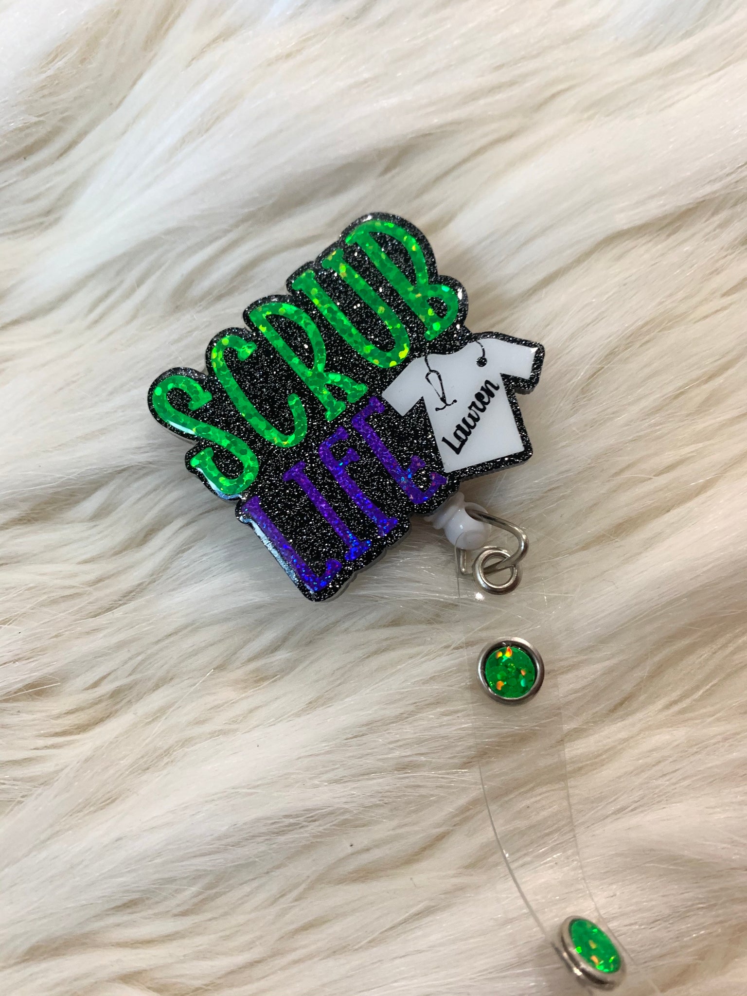 This personalized name badge reel is perfect for anyone in the medical field. It measures approximately 2 inches long. It is made from high quality laser cut 1/8″ cast clear acrylic. It is designed with durable professional grade vinyl, a sturdy alligator clip badge reel, and sealed with uv resin.